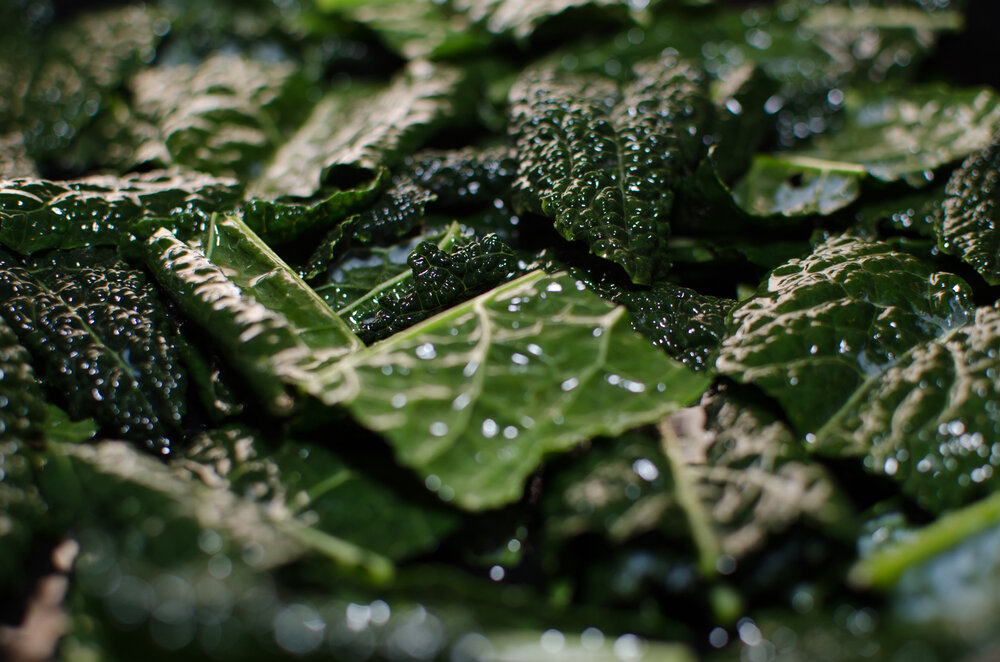 - Удалите листья капусты со стеблей и разорвите листья примерно на 2-дюймовые кусочки. Убедитесь, что листья максимально сухие. (Если вы выращивали капусту в своем саду органически, вам, вероятно, не нужно мыть ее, но если вы все же решите ее мыть, промокните ее насухо и пропустите через счетчик для салата.)