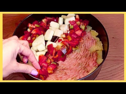 3 или 4 картофелины 1 баклажан 1 болгарский перец 300 г мясного фарша (11 унций) розмарин, тмин, панировочные сухари растительное масло, соль