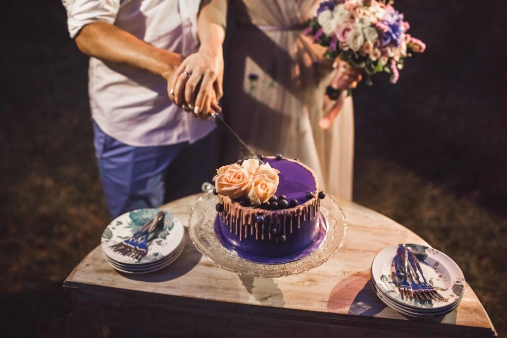 Черничный цвет – это насыщенный синий, с небольшим оттенком фиолетового цвета. С ним отлично будет гармонировать белый цвет. В тандеме они создадут торжественное настроение и придадут празднику шарм. Для разнообразия можно дополнить элементами золотистого, шоколадного, бирюзового, розового цветов.