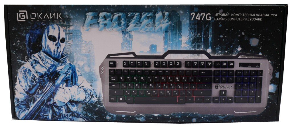 Сегодня мы рассмотрим мембранную игровую клавиатуру Oklick 747G Frozen стоимостью чуть дешевле 1000 рублей. Из интересного – RGB подсветка, конструкция скелетон, защита от воды и ещё одна интересная фича, о которой расскажем в этом обзоре. Oklick 747G Frozen Клавиатура поставляется в картонной коробке, полиграфия приятная глазу. В комплекте идёт лишь макулатура. Oklick 747G Frozen имеет конструкцию скелетон, то есть клавиши возвышаются над основанием. Но не надо обольщаться – это мембранная клавиатура. Корпус выполнен из сочетания пластика с металлом, весит клавиатура 650 грамм. Раскладка – полноразмерная, достаточно стандартная, разве что пробел с Alt немного шире, чем другие кнопки. Дополнительных кнопок нет, но на функциональные клавиши заведены мультимедийные функции. Клавиши нажимаются чуть мягче, чем у среднестатистической мембранной клавиатуры. Снизу на клавиатуре есть небольшие выступы, своего рода намёки на подставки под запястье. Сверху имеется характерный выступ,