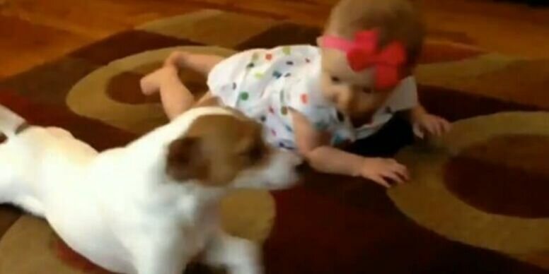 В этом коротком ролике, собравшем свыше 300 тыс. просмотров, чудесно все. Прежде всего, умиляет сюжет: неутомимый и вездесущий джек-рассел-терьер, батарейка-энерджайзер, преподает первые уроки ползания крохотной малышке. Именно так – не первые шажки, а первое ползание. Молодые родители знают: ползание – важная веха в развитии малышей. И как же хорошо, когда часть работы берет на себя четвероногий помощник!