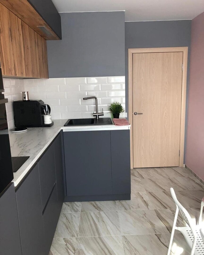 Нижние фасады и часть верхних оформили в сером цвете с матовым покрытием. Столешницу решили сделать под мрамор, а фартук выложили в стиле белого кирпича. Вот тут мне кажется была ошибка, ведь мрамор и кирпич в сумме с двумя расцветками фасада выглядят слишком нагромождено. Следовало отдать предпочтение какому-то одному варианту и использовать его в отделке фартука и столешницы.
