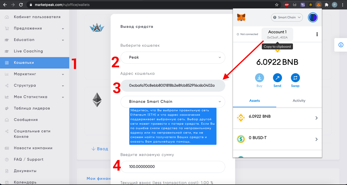 Настройки Metamask для работы в сети BSС https://zen.me/udKD3 Вывод Peak токена на свой кошелек Metamask 1) Заходим в личный кабинет в раздел КОШЕЛЬКИ 2) Выбираем кошелек Peak.