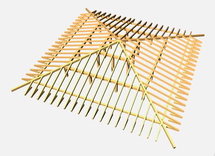 Конструкция стропил у шатровой крыши включает в себя два вида стропильных ферм. Первая группа – простые фермы скаты, их соединяют на коньке, вторая группа – боковые стропила. Теперь устанавливаем диагональные стропила. Здесь важна точность работы. Эти стропила отвечают за прямоту скатов плоскостей и их ровность. Нужно уделить особое внимание длине и углу наклона, они должны быть равными для всех
