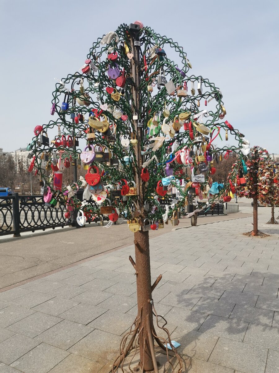 Около Болотной набережной стоят очень симпотичные деревья, усыпанные замками с надписями влюбленных и их клятвами быть вместе навсегда.