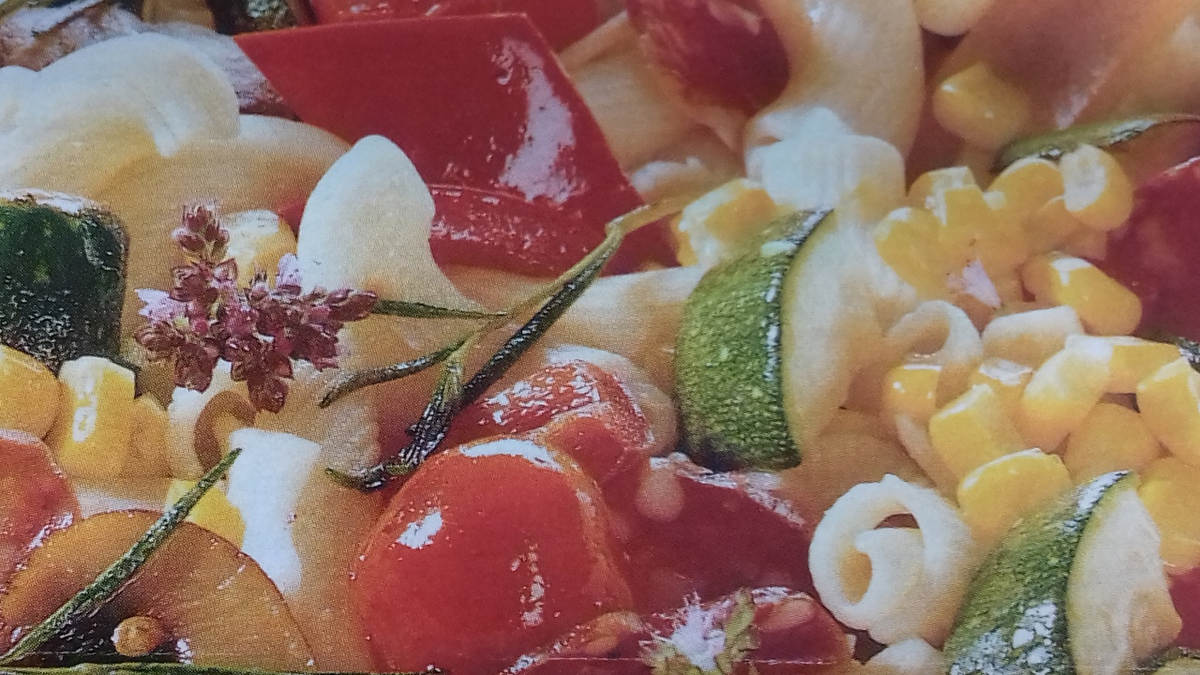 Теплый салат с грибами, овощами, макаронами и ароматными травами.