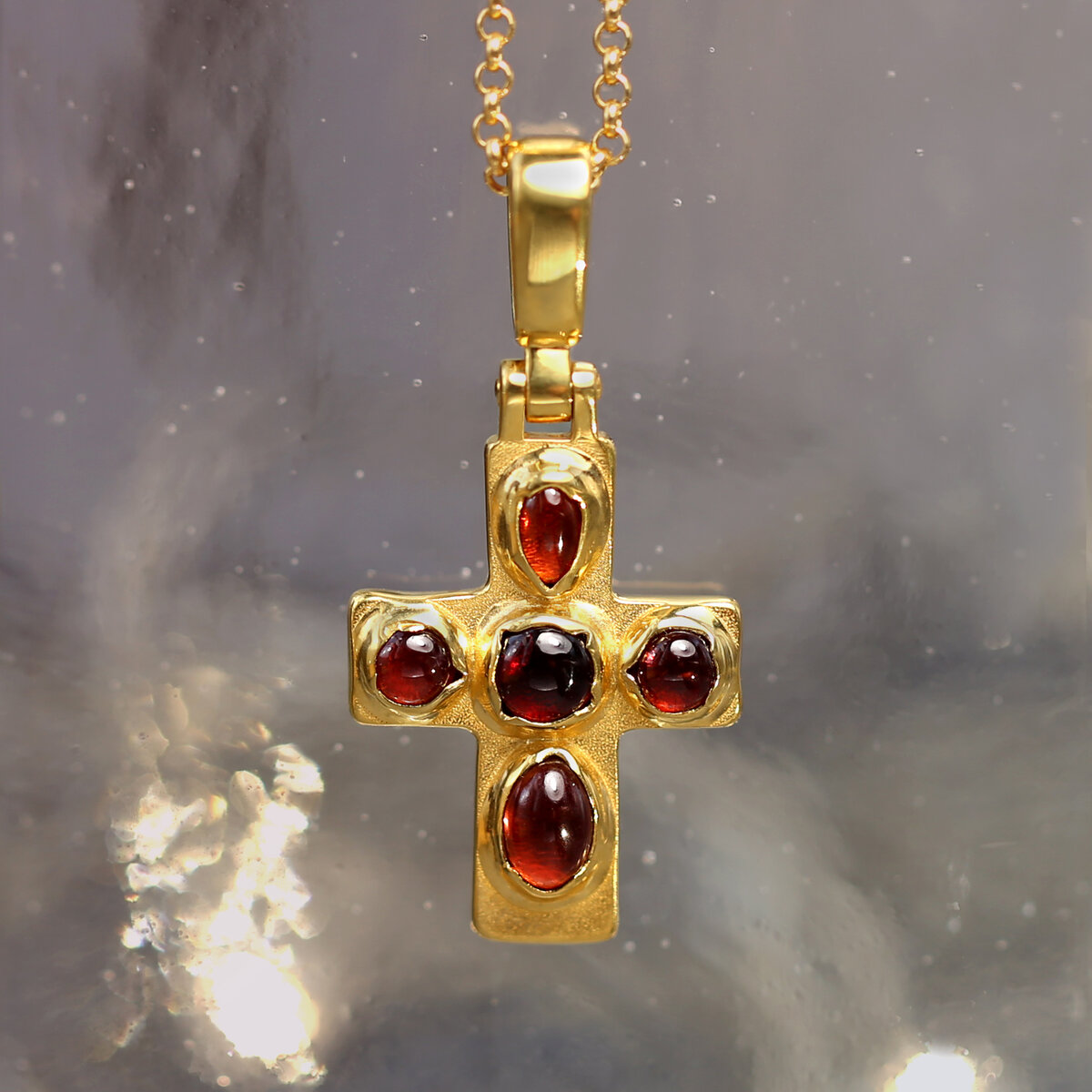В наших крестиках, подвесках и кольцах можно встретить драгоценные камни разной огранки, разного цвета, и это всегда неслучайно. Дело в том, что у каждого камня есть давно сложившееся символическое значение, которое переосмыслено в христианском искусстве и используется художниками для создания наиболее ярких своих творений. Например, камни красного цвета - рубин, гранат и другие - в христианстве символизируют кровь Христову и жертву Спасителя. Крест с кабошонами (камни), серебро 925° с позолотой Голубой цвет традиционно символизирует чистоту и непорочность – в христианстве это, конечно, богородичный цвет , и для изделий на эту тему используют камни сине-голубых оттенков: сапфир, аквамарин, топаз. Крест, белое золото 585°, 2 бриллианта, 4 сапфира