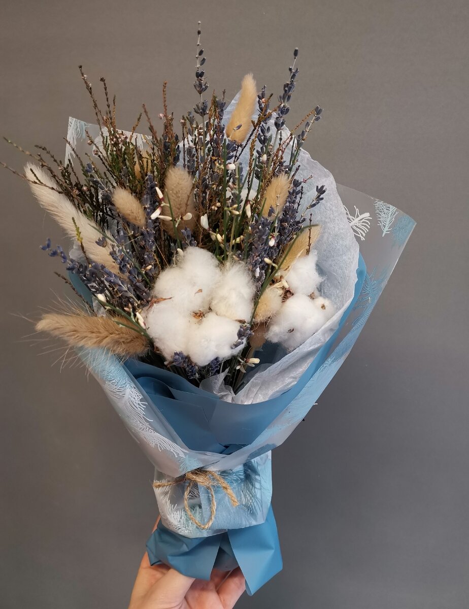 Привет! В работе с цветами используются не только свежие цветы, но и сухоцветы. Причём используются активно! Они могут выступать как самостоятельные цветы для составления композиции (букет сделан только из сухоцветов), и как добавочные элементы. Сухоцветов, которые используются во флористике масса: тысячелистник, полярис, целозия, ковыль, тритикум, краспедия, эрингиум (синеголовик), различные злаки, физалис, хлопок, картадерия, лагурус, лунария, дипсакус (ворсянка), лаванда, и многое другое. Все сухоцветы бывают, как натуральной окраски, так и крашенные. Тут уже все оттенки, какие хочешь))) Выбор цветка зависит от вашей задумки и фантазии.