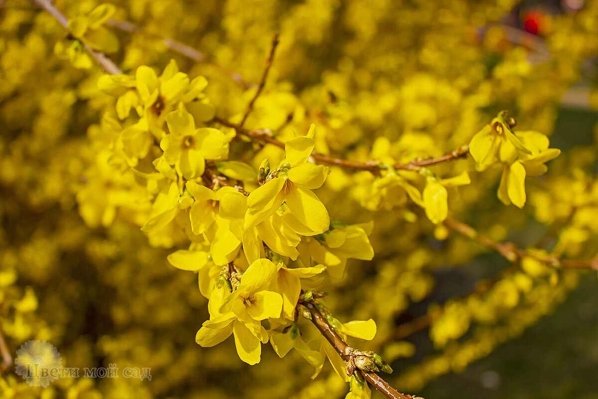 #Форзиция - это прекрасный цветущий кустарник, принадлежит к семейству оливковых. Весьма быстрорастущий кустарник, не требующий особого ухода. Очень - очень рано зацветает, когда еще кругом ничего нет, ни зелени, ни цветов (ну разве, что луковичные). Причем листьев еще нет, одни слошные желтые цветы. Если у вас в саду еще нет форзиции - очень рекоменндую. Растение неприхотливо, форзицию очень легко сажать и очень легко выращивать. Практически не требует обслуживания, в засушливое лето поливаем только молодые кустики, если ваш куст уже высотой 3 метра, смысла поливать уже нет. Болезней я не замечала, ни разу ничем, никогда форзиция у нас не болела Цветущий куст прекрасно себя чувствует под солнцем, хотя и затенение переносит спокойно, но на солнечном месте обильнее цветет. Хотя у нас есть кусты и на теневой стороне дома. Солнце только вечером 2-3 часа и цветет ничуть не хуже чем на солнечной. Размножать можно черенками и отводками. Черенки прекрасно укореняются. Семенами мы не пр
