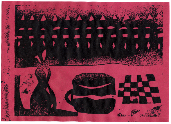 Так печатная форма создается из картона. Бумага, на которой печатаются работы, может быть цветной или белой, ватманской или писчей, гладкой или фактурной. Краски цветные: темпера или акрил. Нужны ванночки для красок, валики для прокатывания красок (на каждую краску по одному) и валик для прокатывания по чистому, сухому листу. Под ним лежит печатная форма с уже накатанной краской.