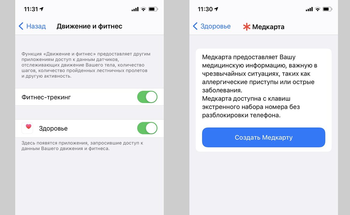 - Далее необходимо зайти в приложение Здоровье и создать там медкарту, где нужно прописать свой возраст, вес и рост.