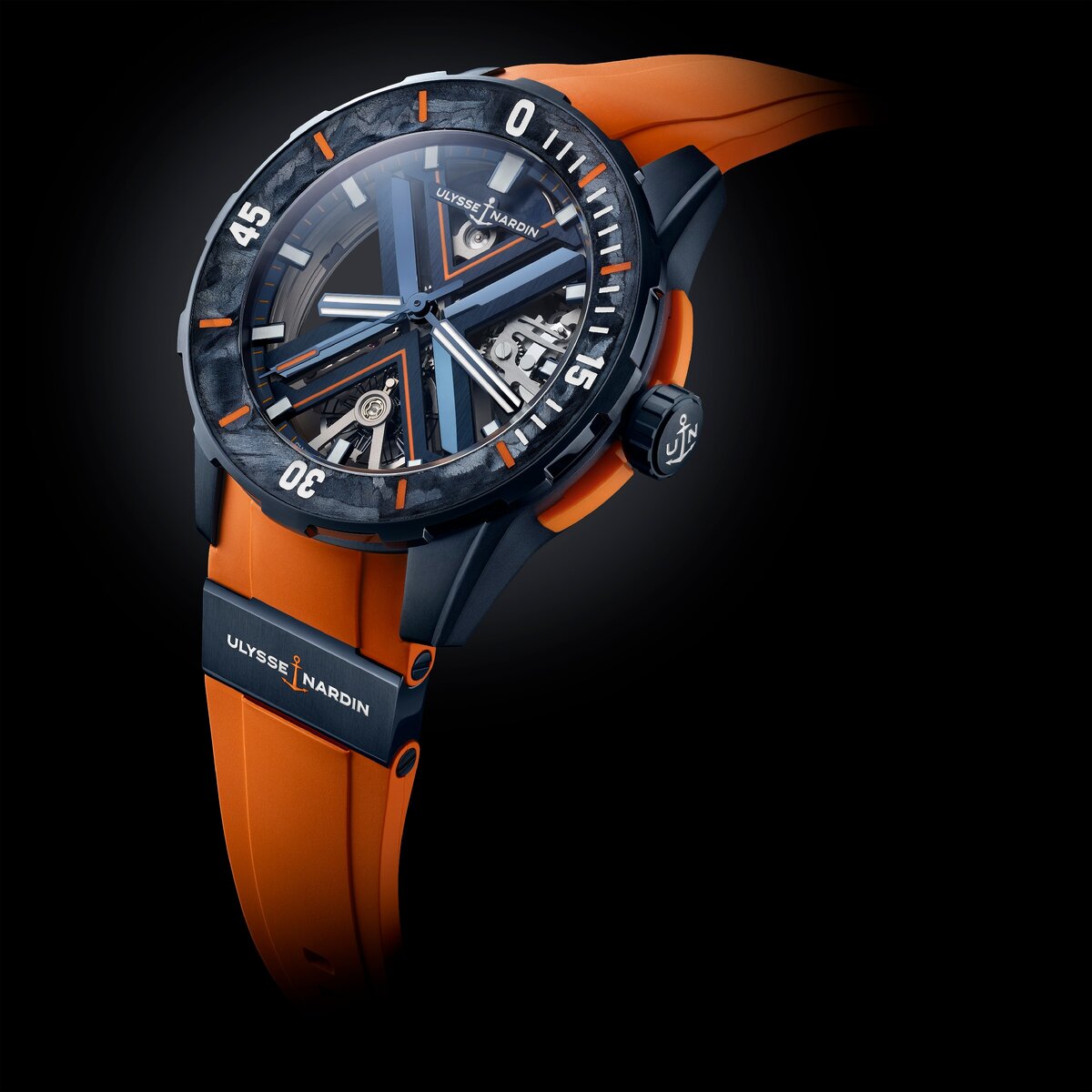 Запас хода сохраняется на 96 часов с частотой биений 21 600 бит / ч. Смелый дизайн Ulysse Nardin Diver X Skeleton совместим с двумя вариантами спортивных каучуковых ремешков: в сдержанном темно-синем или смелом оранжевом цветах.