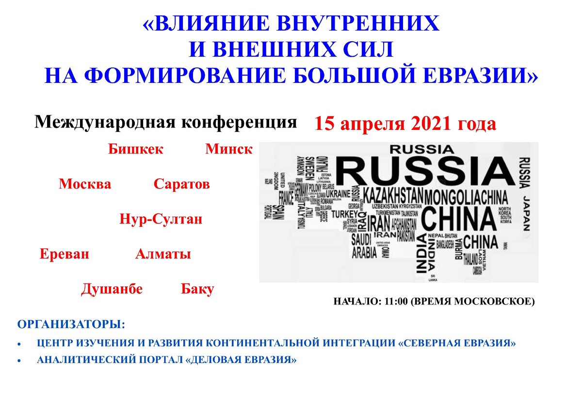 Аналитический портал «Деловая Евразия», Центр изучения и развития континентальной интеграции «Северная Евразия» выступают инициаторами проведения международной онлайн-конференции на тему: «Влияние внутренних и внешних сил на формирование Большой Евразии».