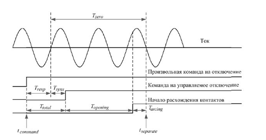 На рисунке представлен принцип управляемого отключения. На синхронизирующее устройство в случайный момент времени t подается команда на отключение выключателя. Эта команда задерживается контроллером на некоторый промежуток времени T . Интервал времени T в соответствии с выражением T = T р + T представляет собой сумму времени реакции контроллера T р и преднамеренной задержки времени синхронизации T . Интервал времени T рассчитывается по выражению T = T − T − T относительно определенного момента переходного тока через ноль и зависит от собственного времени отключения выключателя T и времени расхождения контактов на определенное расстояние, достаточное для обеспечения необходимой электрической прочности промежутка t .