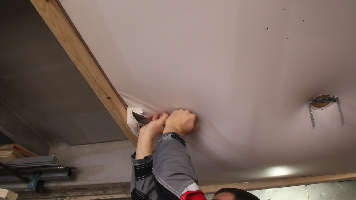 Если полотно в данном случае не сильно порвано, его можно заклеить, скрыв затем похожей по цвету краской. В случае небольшого разреза на потолке, его рекомендовано