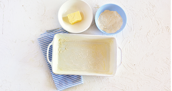 Разогрейте духовку до 180 °С. Прямоугольную форму смажьте сливочным маслом и обсыпьте мукой, излишки стряхните.