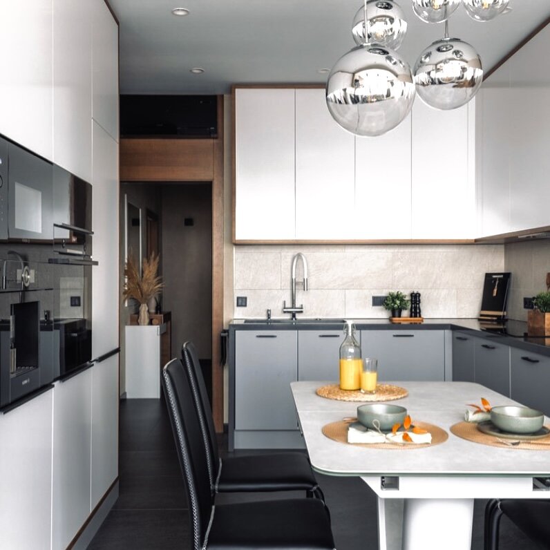 - Не делаем шкафы в потолок. Сразу думаем о дизайне и либо зашиваем пространство над кухней гипсокартоном, либо делаем намеренно низкие шкафы по дизайну.