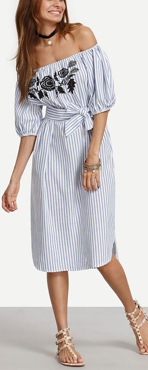 Названий у этого фасона несколько: "платье с открытыми плечами", "барышня-крестьянка"(хотя под этот термин подводят до десятка фасонов), "вырез кармен".
