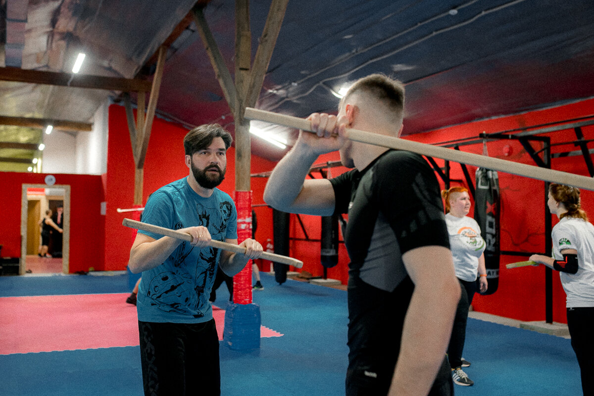 16. Изучение базы начинается с работы на боевом оружии без защиты. В дальнейшем, отработка всех техник сочетает работу как на боевых, так и на спарринговых батах. Работа боевым оружием без защиты приучает беречь руки и правильно реагировать на удары противника. Кроме того, деревянные баты в силу своих технических особенностей ведут себя весьма отлично от спарринговых имитаций.