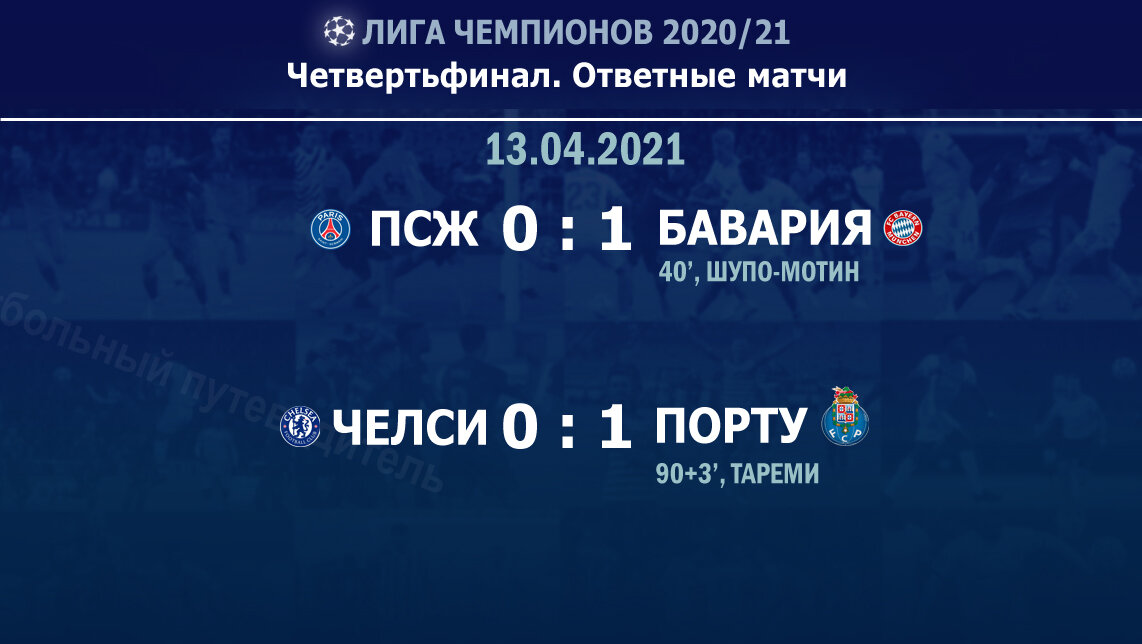 Привет всем! Сегодня Лига Чемпионов и первые ответные матчи четвертьфинала. Оба матча завершились победами гостей с минимальным счётом.