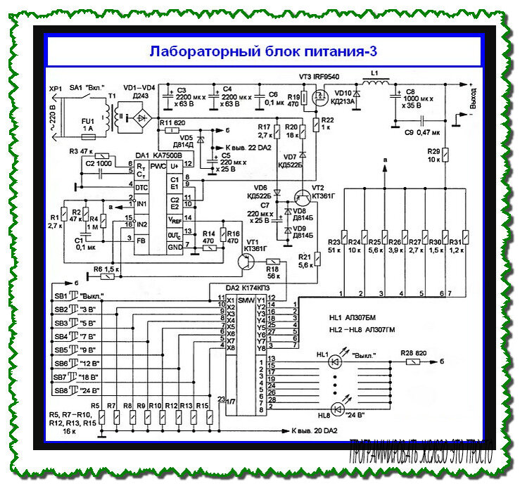 Сегодня мы рассмотрим не сложный в изготовлении лабораторный источник питания . Данный стабилизированный источник питания имеет несколько фиксированных значений выходного напряжения, которые устанавливаются нажатием на соответствующие кнопки. Он обеспечивает выходной ток до 2,7 ампера и снабжен защитой от токовых перегрузок, имеет высокий КПД при любых значениях выходного напряжения. Эта радиолюбительская схема не содержит дефицитных деталей и проста в сборке.лок питания формирует семь значений выходного напряжения: 3,5,7,9,12,15,18 и 24 вольта, которые можно изменить по желанию в процессе наладки устройства.