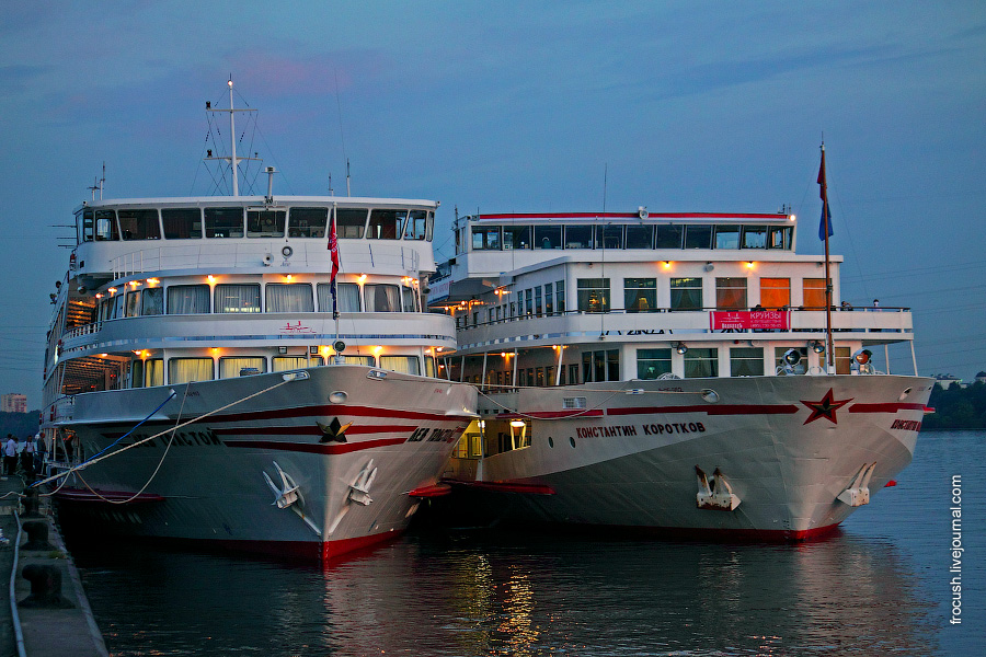 8 июля 2010 года. Вечернее фото теплоходов «Лев Толстой» и «Константин Коротков» у причала Северного речного вокзала Москвы.