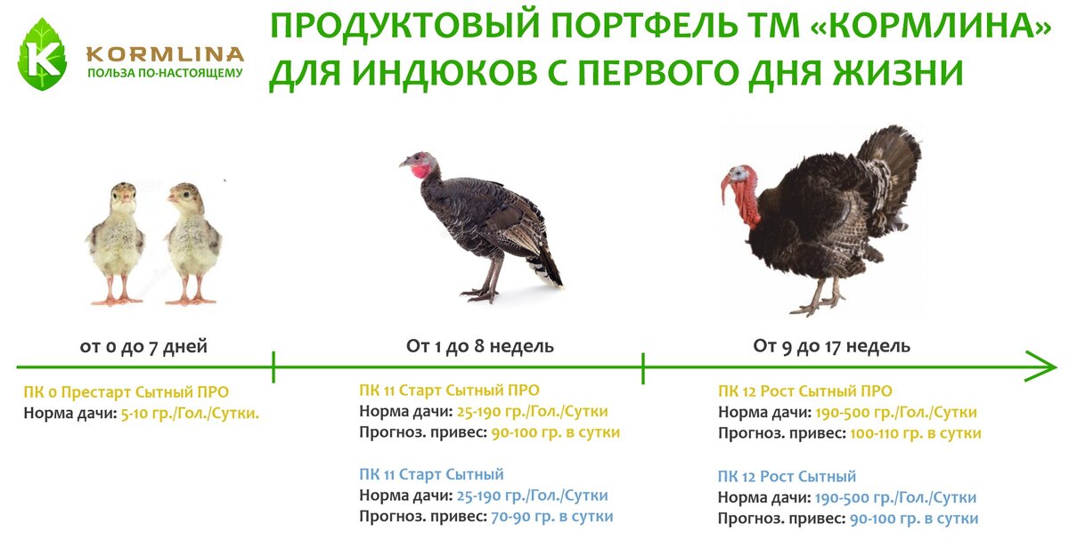 от 1 до 8 недель: начало активного роста, формирования опорно - двигательного аппарата и физиологического развития индюшонка. На данном этапе так же важны питательные характеристики корма. ПК - 11 Сытный Про имеет показатель обменной энергии 290 кКал на 100 гр., а сырого протеина - 21%. У ПК-11 Сытный эти показатели ниже: обменная энергия 263 кКал на 100 гр., сырой протеин - 17,0%, поэтому для достижения желаемого результата его норма расхода будет выше, чем у комбикорма ПК в линейке Сытный ПРО.