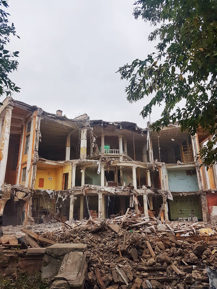 Когда мы приехали сюда, на крыше были замечены рабочие, которые сбрасывали вниз обломки. И как я понимаю, сейчас здание находится в таком же состоянии. Хотя как водится, у здания статус объекта культурного наследия.