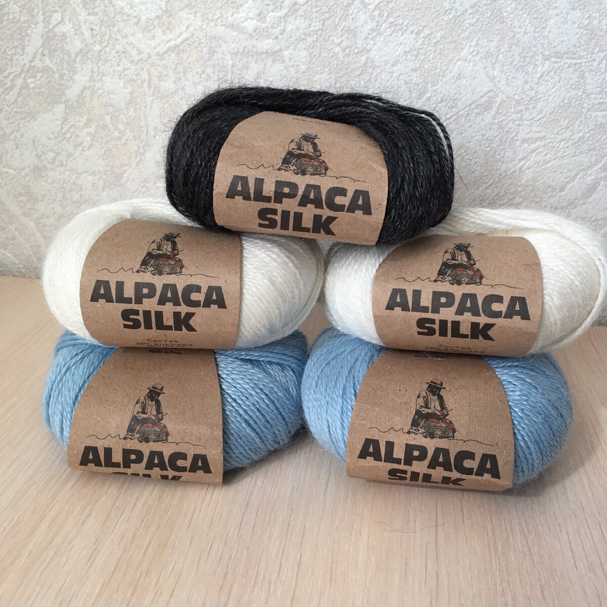 Пряжа Alpaca silk, состав 60% альпака, 40% шёлк, в 50 гр-150 м. В наличии у меня 10 мотков голубого, 2 мотка белого и 2 мотка чёрного, итого 700 грамм.