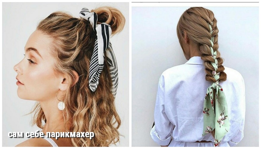 Высокий пучок на макушке, завязанный платком или повязкой поверх резинки создаст игривый свежий образ. Такая прическа хорошо подойдет молодым девушкам с длинными волосами.