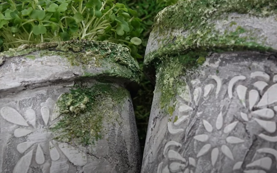 Берём обыкновенные пластиковые банки или ведёрки, обрабатываем поверхности наждачной бумагой. Затем создаём необходимый узор рельефной пастой на пластике и имитируем мох при помощи акриловых красок :)