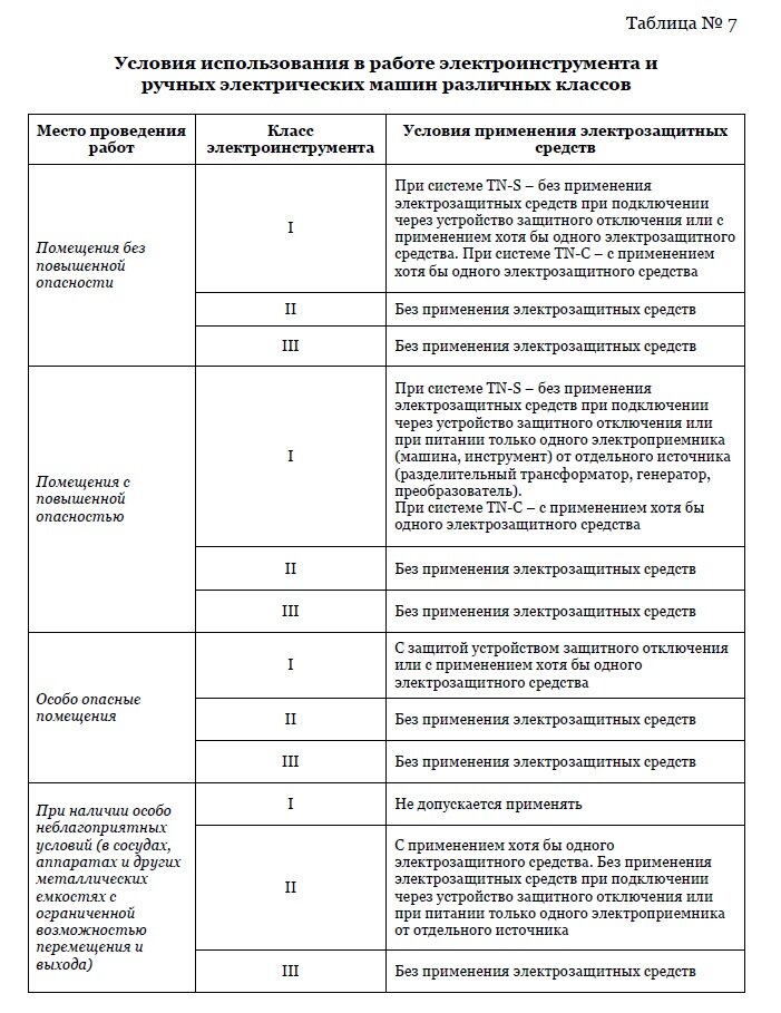 При этом в вопросе есть отсылка к «Правилам по охране труда при эксплуатации электроустановок», утв. Приказом Минтруда России от 15.12.2020 № 903н (далее – Правила), где действительно упоминаются три класса электроинструмента. В Правилах отмечается, что класс переносного электроинструмента и ручных электрических машин должен соответствовать категории помещения и условиям производства работ с применением в отдельных случаях электрозащитных средств согласно требованиям, приведенным в таблице № 7.