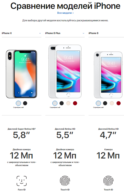 Компания Apple активно пользуется таким способом подачи информации, сравнивая две и больше моделей своих товаров, начиная от диагонали экрана и заканчивая характеристиками камер, связи, безопасностью, качество аудио и видео, показателями аккумулятора. Это довольно развернутый материал на несколько экранов.