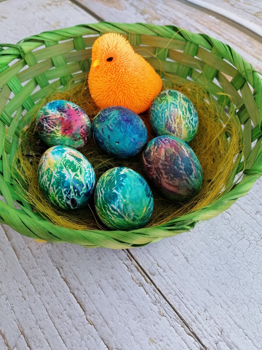 По тому же принципу можно достичь оранжевого цвета. Морковный сок втереть в сваренное яйцо. Можно сделать разводы, совместив свекольный и морковный соки. Эти два способа не гарантирую идеальной стойкости цвета. И руки могут пачкаться.