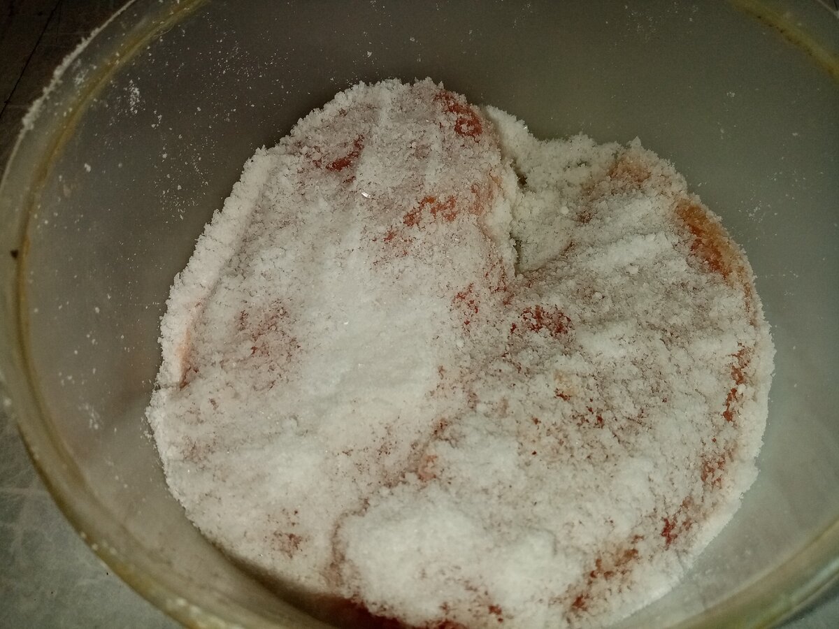 Итак, я использовала два куриных филе. Их надо подготовить: срезать малое филе, убрать жир и пленки. Затем тщательно натереть солью, следите чтобы мясо было покрыто солью полностью, без проплешин. Взять посуду, которую можно будет герметично закрыть. В нее насыпать слой соли, сверху выложить филе и сверху вновь засыпать солью. Накрыть крышкой, убрать в холодильник на сутки просаливаться.