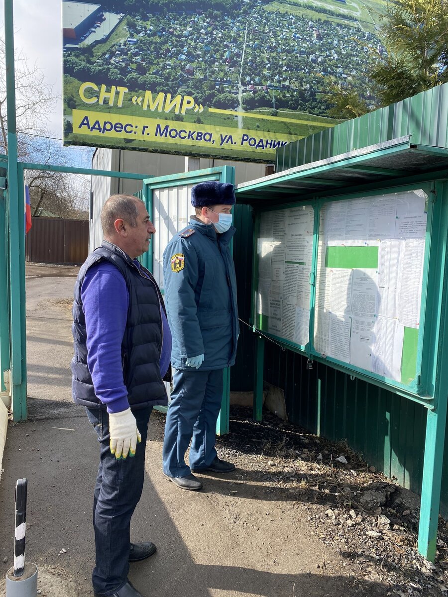 Чтобы напомнить жителям правила пожарной безопасности в пожароопасный период, сотрудниками 4 РОНПР Управления по ЗАО ГУ МЧС России по г. Москве проведён рейдовый осмотр СНТ Мир. Данная работа направлена на снижение риска возникновения загораний, как в природных условиях, так и в жилом секторе. Инспектора подробно объяснили жителям правила поведения и алгоритм действий в случае пожара. Уделяя