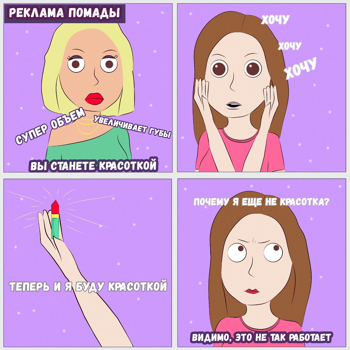 Всем привет! В детстве на бумаге я часто рисовала какие-нибудь забавные комиксы. И вот совсем недавно вспомнила об этом увлечение и решила вновь попробовать создавать короткие забавные зарисовки, но уже с помощью графического планшета. И вот что у меня из этого вышло: 1. Реклама vs Реальность У вас тоже были такие моменты, что смотрите рекламу косметики или одежды, видите как модель очень классно выглядит в этом, и уже представляете, как купите вещь и тоже будете сиять. Но маркетинг и существует для того, чтобы продавать нам товары. Поэтому какую вы бы помаду не купили - ваши тонкие губы не станут такими же пышными, как у девушки из рекламы. 2. Родители Согласитесь, что бывает такое: когда родители рядом, то мы все знаем и умеем. Сколько нужно жарить котлеты, как отстирать пятно на футболке, как приготовить борщ т.д. Но стоит съехать от родителей и попробовать жить самостоятельно, то тут выясняется, что порой мы даже не знаем элементарных вещей. И тут сразу начинаются звонки маме, чт