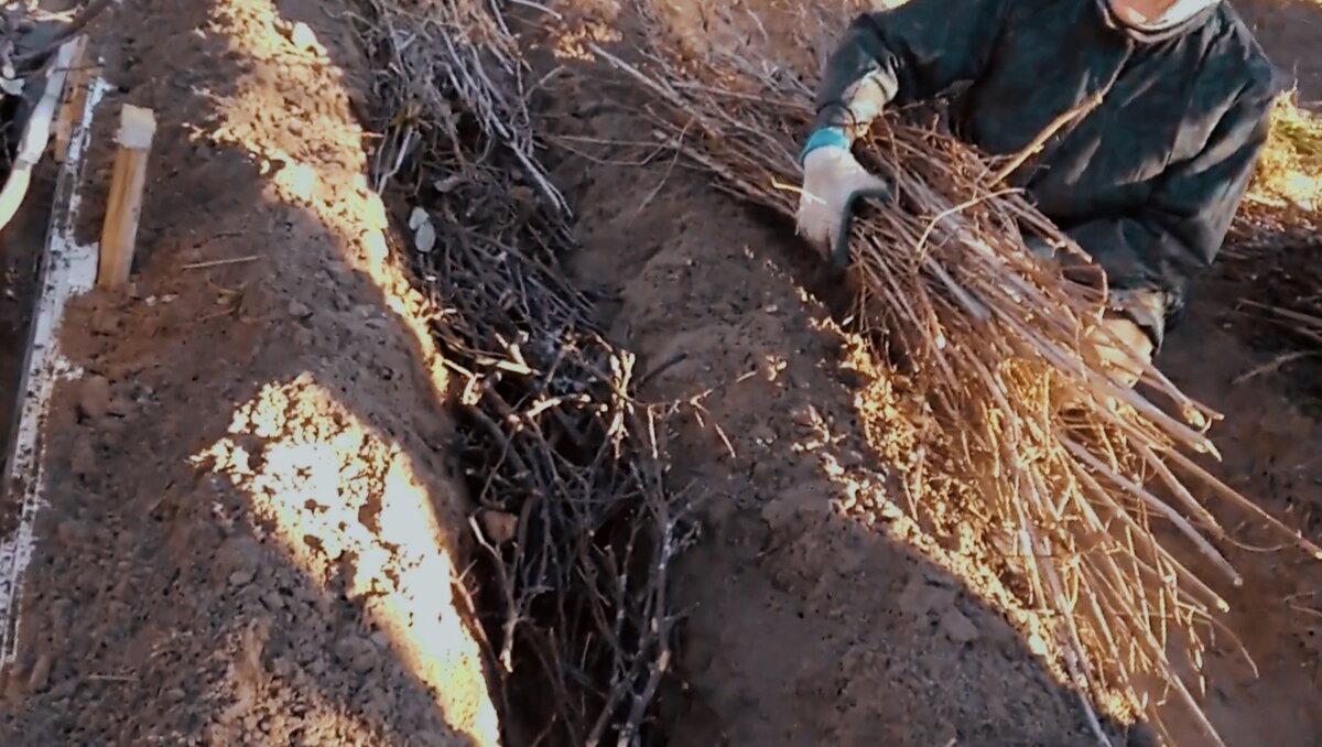 далее древесина помельче: ветки деревьев, кустарников, поросль малины и тоже поливаю большим количеством воды. Глубина - 5 см ;
