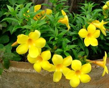 Алламанда чрезвычайно красива во время цветения. Ее изящные стебли покрыты глянцевыми темно-зелеными овальными листьями длиной 10—15 см. На этих стеблях постепенно, в течение всего лета, вплоть до осени раскрываются ослепительно желтые колокольчики, достигающие 10 см в диаметре.