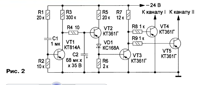 Усилитель не склонен к самовозбуждению. Для ещё большей устойчивости установлены корректирующие конденсаторы С2 и С4. Усилитель имеет хорошую ремонтопригодность. Выходной и дифференциальный каскады можно подключать к питанию независимо друг от друга, проверяя их работоспособность раздельно. При подаче питания на усилитель выходной каскад отключён на несколько секунд, пока не закончится переходной процесс. Отключение производится выходным сигналом "Канал Г ("Канал II") с узла задержки, схема которого показана на рис. 2, путём замыкания базы транзистора VT3 (см. рис. 1) на общий провод. Транзистор закрывается, отключая ток управления выходным каскадом. Это исключает нежелательные броски тока на выходе усилителя, что повышает его надёжность.