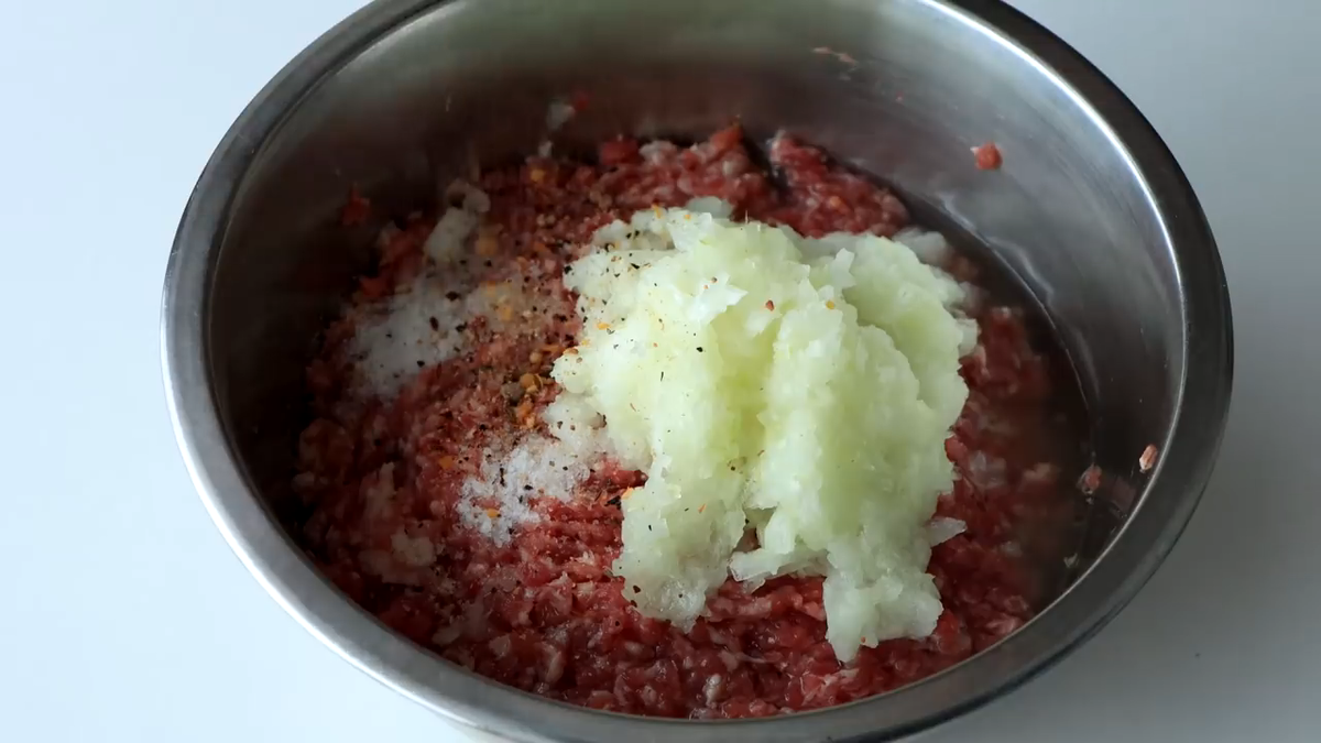 Нам понадобится 400 граммов фарша, у меня смесь говядины и свинины, также одну луковицу необходимо пропустить через мясорубку и добавить к фаршу также добавляю сюда 1 чайную ложку соли и специй, теперь хорошенько перемешаем фарш чтобы он перемешался с луком и специями