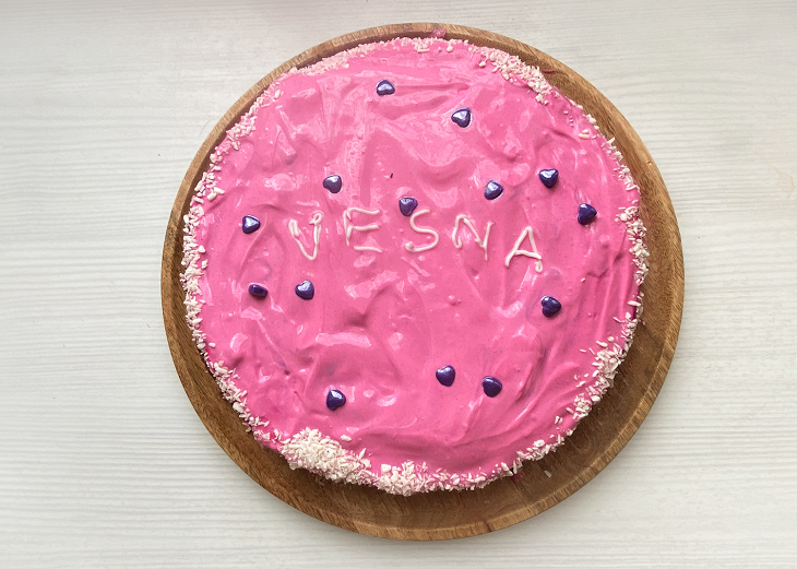 Торт я делала поздно вечером в понедельник, поэтому рецепт выбрала самый быстрый. Использовала три готовых коржа, крем из сахара и сметаны, кокосовую стружку, сахарный карандаш для надписи и розовый краситель. Сначала я пыталась нарисовать сердечки самостоятельно, но поняла, что ничего не выйдет — они выглядели как белые кляксы.
