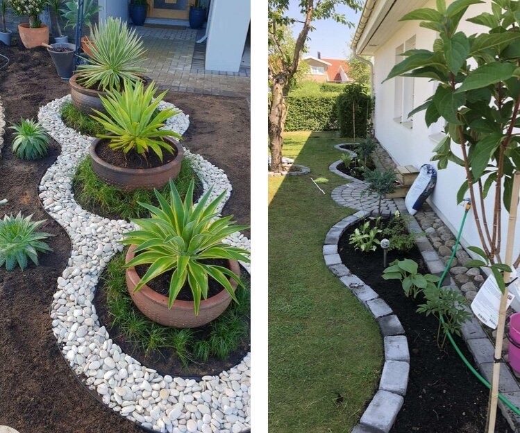 Грядки и цветники необычных форм рекомендуется выложить кирпичами, камнями или галькой. Подобное зонирование приближено к дизайнерскому и выглядит очень благородно.