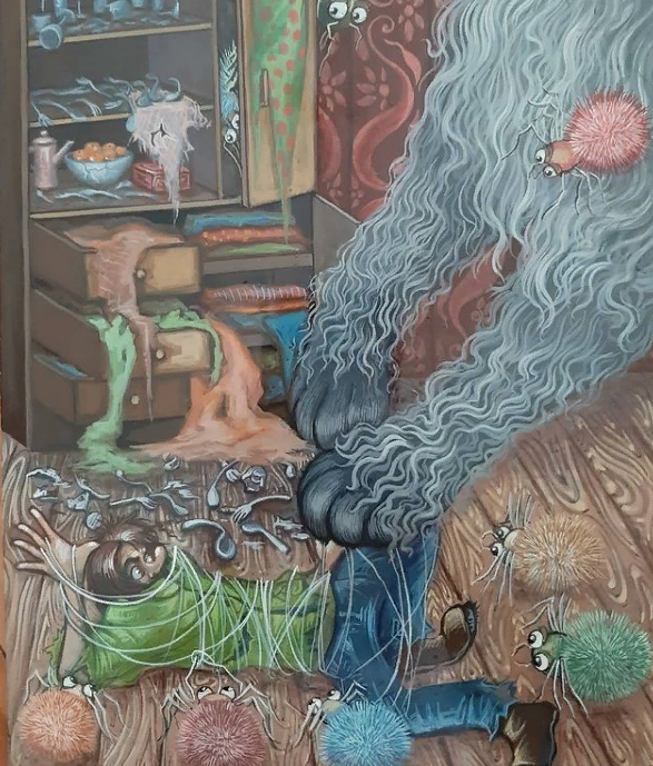 Из открывшейся дверцы подпола медленно вылезла черная тень. Подошла к серванту и начала бить посуду, рвать полотенца, выбрасывать и гнуть ложки. ОНО так увлеклось, что не заметило боевой отряд пауков, держащих наготове сеть и медленно сжимавших кольцо вокруг.