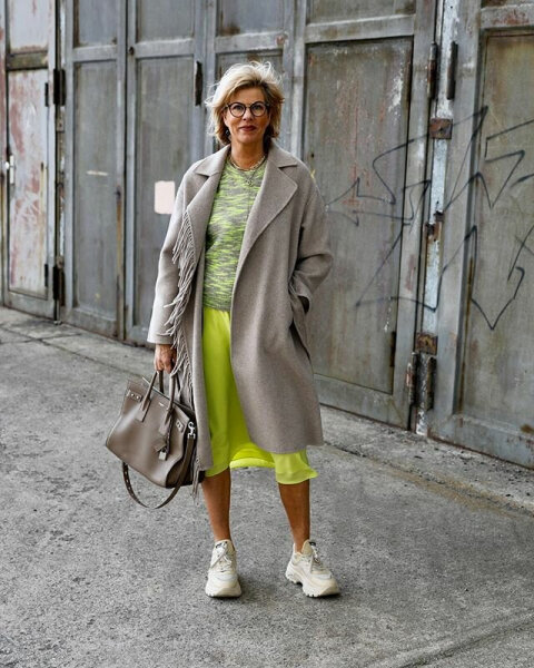 Носить кроссовки можно не только с куртками, но и с пальто. Это может быть, как пальто классического силуэта, так и современные модели . Серое прямое пальто, украшенное бахромой можно смело комбинировать с яркой одеждой. Например, с юбкой из легкой ткани грушевого оттенка и зелено-желтым меланжевым джемпером. Стильным дополнением этого эффектного весеннего образа станут белые кроссовки.