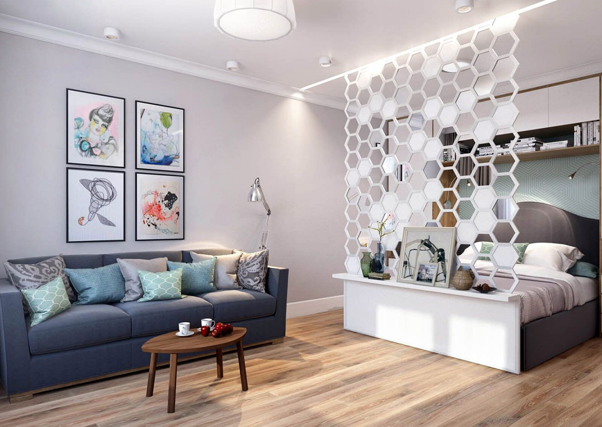 Перегородка может быть и небольшой, как в этой гостиной-спальне.