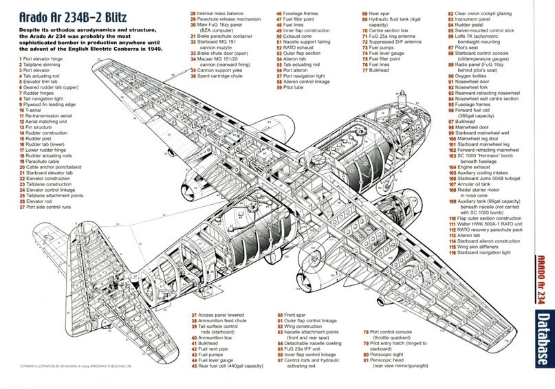 Также было еще три версии самолета – C, D и Nachtigall. Версия Ar 234 C была сделана из-за недостатка к концу войны Jumo 004, которые по большей части шли на создание Me 262. Вместо них на самолет были установлены 4 двигателя BMW 003, которые, хоть и обладали меньшей тягой, в сумме давали больше тяги нежели два двигателя Jumo, и таким образом компенсировали несколько возросшую массу. Версия D имела в себе двигатели HeS 011A с тягой в 1300кгс (Jumo 004 – 900кгс, BMW 003 – 800кгс), но эти двигатели были еще капризнее, чем двигатели Jumo, и потому запуска крупносерйиного производства не произошло. Версия Nachtigall представляла из себя попытку натянуть разведчик на ночной истребитель путем установки пары пушек и радара. Как вы можете догадаться, это ничем хорошим не закончилось и кроме двух опытных самолетов ничего не вышло. Помимо этих трех «основных второстепенных» версий было еще несколько различных проектов, которые таки могли натянуть этот самолет на ночной истребитель и не только, но они существовали лишь на бумаге, а потому известно о них чуть меньше, чем ничего.