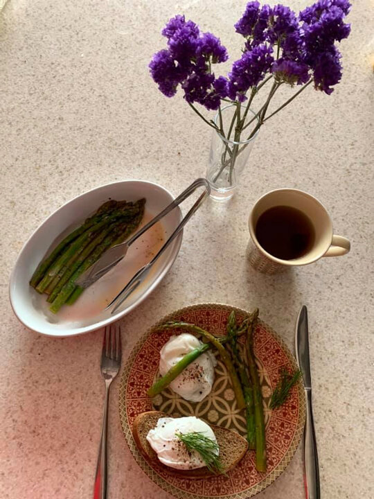 Завтрак. Пашот, спаржа, чай, кусочек цельнозернового хлеба.