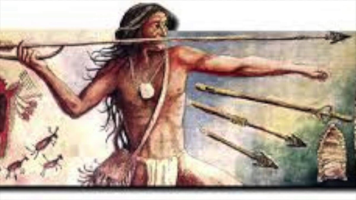 Проблема в том что от эпохи каменного века до нас доходят главным образом орудия из камня, реже кости древесина кожа и прочие органики не сохраняются на столь огромных промежутках времени. Сложно сказать когда человек понял что копье можно метать. Так например исследования костей неандертальцев, показало наличии множественных сросшихся переломов. Схожих по характеру с переломами современных участников родео. Натолкнули исследователей на мысль что эти ребята предпочитали добывать зверя что называется в ближнем бою. А вот нашим прямым предком homo sapiens приписывают любовь дистанционному оружию. Однако метание копья занятия не простое тут нужно подобрать баланс освоить технику броска. Хоть современный рекорд дальности приближается к 100 метрам. Достигается такой результат броском по параболе где в наивысшей точке снаряд сбрасывает скорость до 14 метров в секунду а сам полет может занимать более четырех с половиной секунд достаточную для охоты точность. И эффективность копию сохраняет на расстоянии до нескольких десятков метров. Проблема в том что разогнать увесистая весьма объемная копье одним лишь движением руки до хорошей скорости сложно. Особенно если речь идет не о современном снаряде а изготовленном из дерева и камня. Впрочем люди каменного века и в частности древние представители нашего вида не были столь глупы как многие думают. Для повышения эффективности метания копья была создана простое приспособление. Представляющее из себя дощечку или даже ветку длиной около 60 сантиметров с шипом упором. Суть приспособления было просто копье помещалась на дощечку задней его торец упирался в шип далее совершалось метательное движение в ходе чего дощечка работала как рычаг. Усиливая бросок тот факт что вся энергия передавалась копью через одну точку делал полет последнего более ровным и точным.