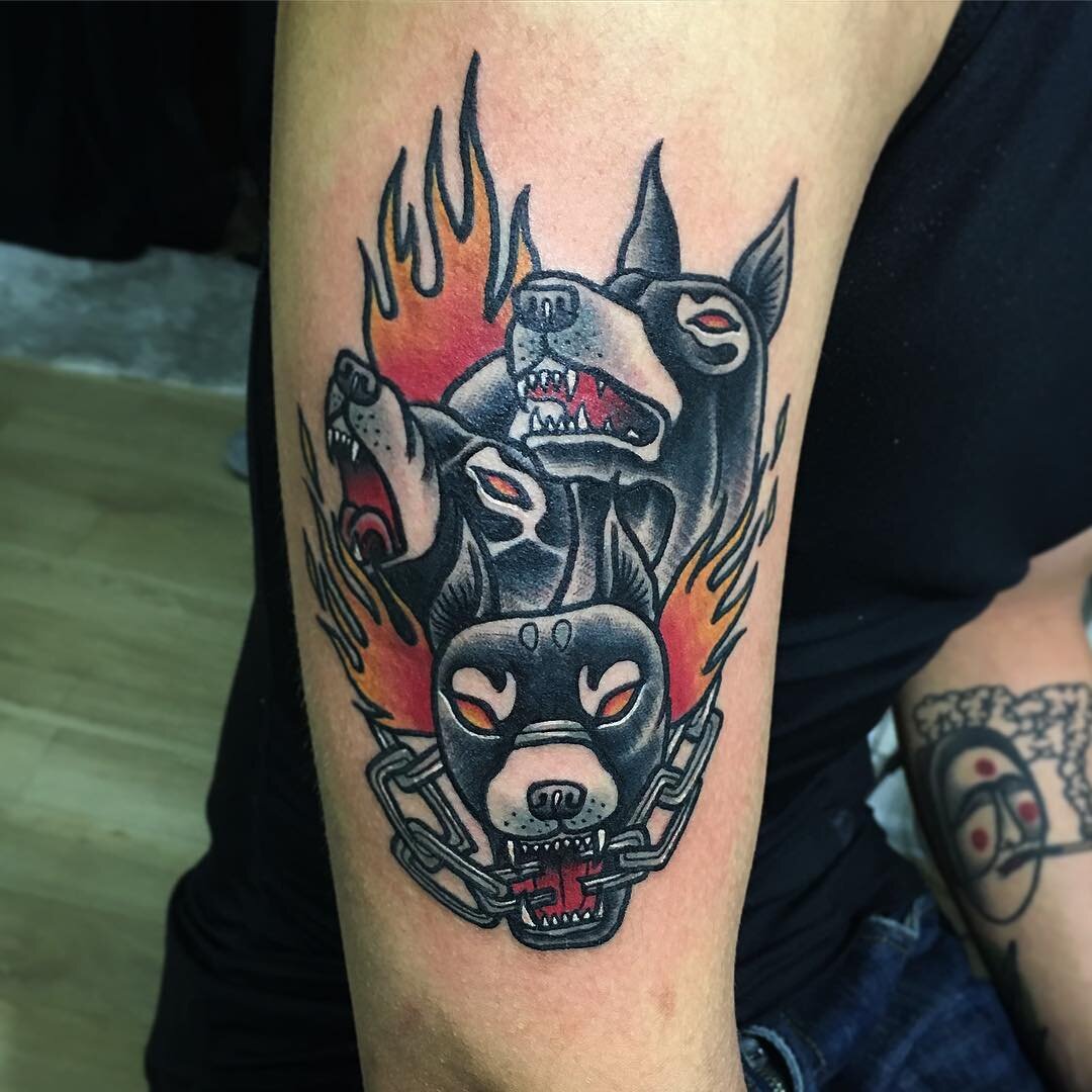 Миф о трехголовом псе Цербере, который охранял вход в Подземное царство, известен с древности. Цербер обладал жестоким, кровожадным нравом. Человек, выбравший татуировку Цербера, должен обладать сильным, волевым характером, чтобы смысловая нагрузка тату соответствовала его суровому нраву. Значение татуировки Цербер – это сила, жестокость и готовность служить своим идеалам (Цербер был очень верным